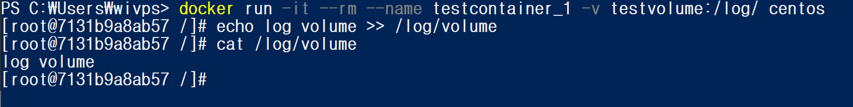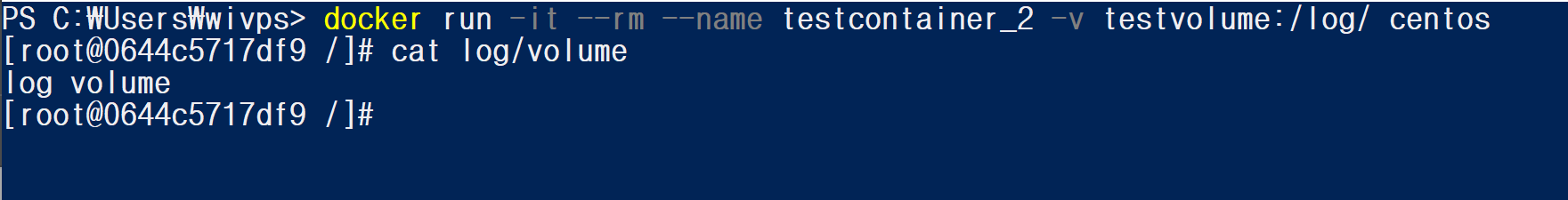 docker run -it --name testcontainer_2 -v testvolume:/log/ centos