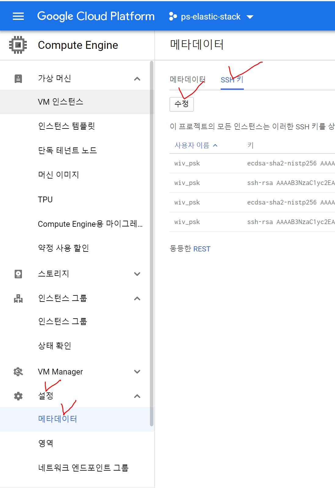 3-1. 메타데이터 > SSH 키 > 수정