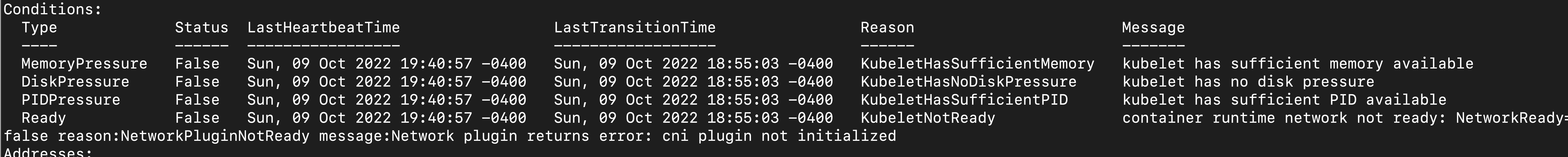 false reason:NetworkPluginNotReady message:Network plugin returns error: cni plugin not initialized