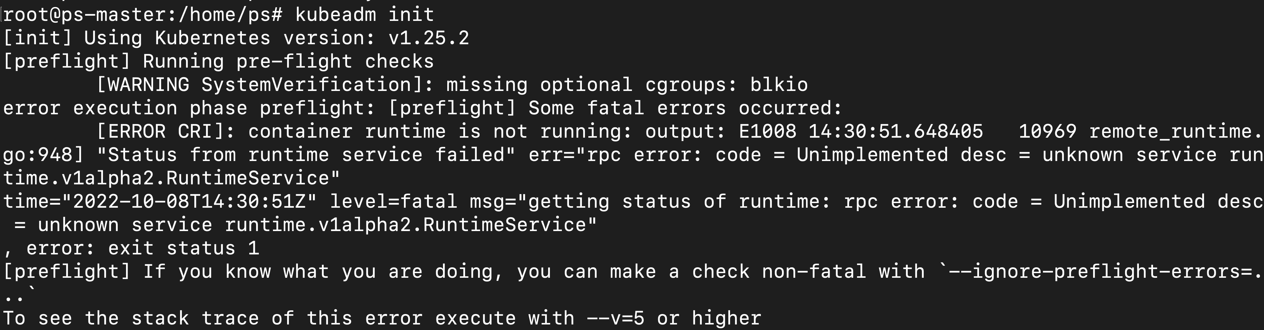 msg="getting status of runtime: rpc error: code = Unimplemented desc = unknown service runtime.v1alpha2.RuntimeService"