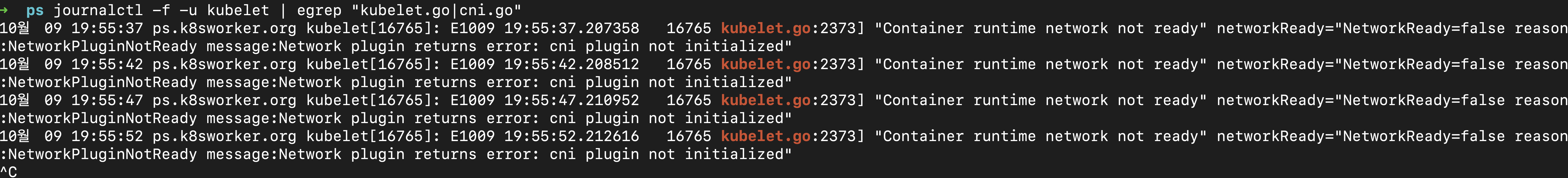 journalctl -f -u kubelet | egrep "kubelet.go|cni.go"