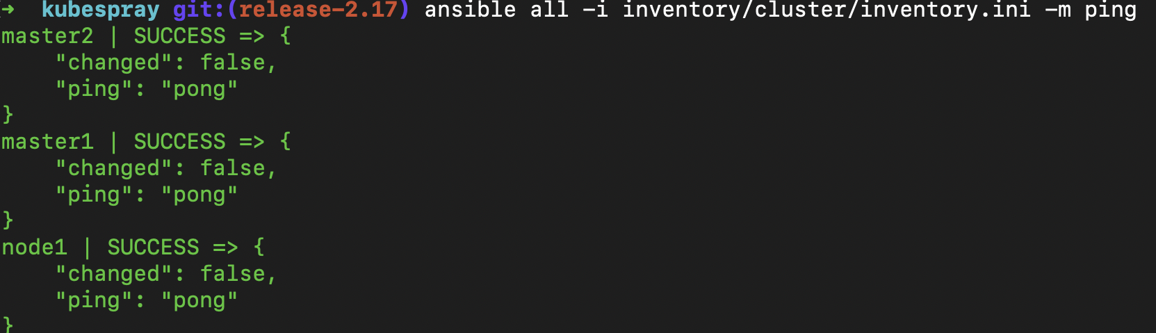 ansible all -i inventory/cluster/inventory.ini -m ping