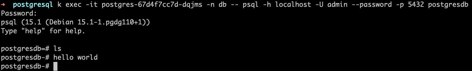 k exec -it postgres-67d4f7cc7d-dqjms -n db -- psql -h localhost -U admin --password -p 5432 postgresdb