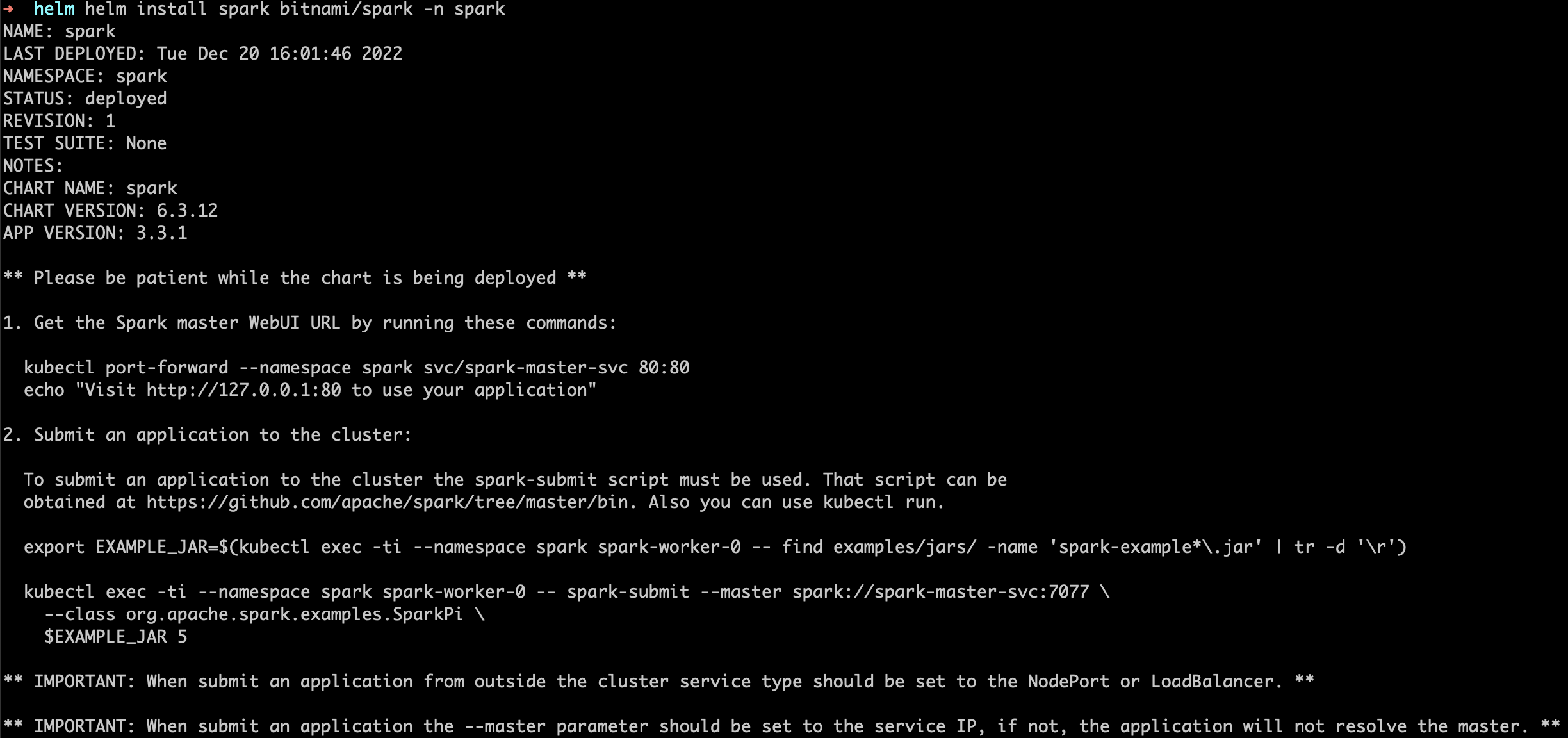 helm install spark bitnami/spark -n spark