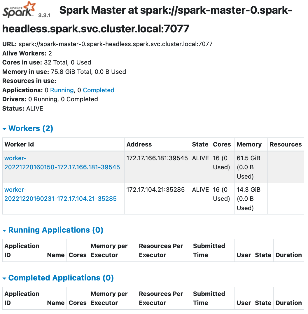 kubectl port-forward --namespace spark svc/spark-master-svc 80:80
