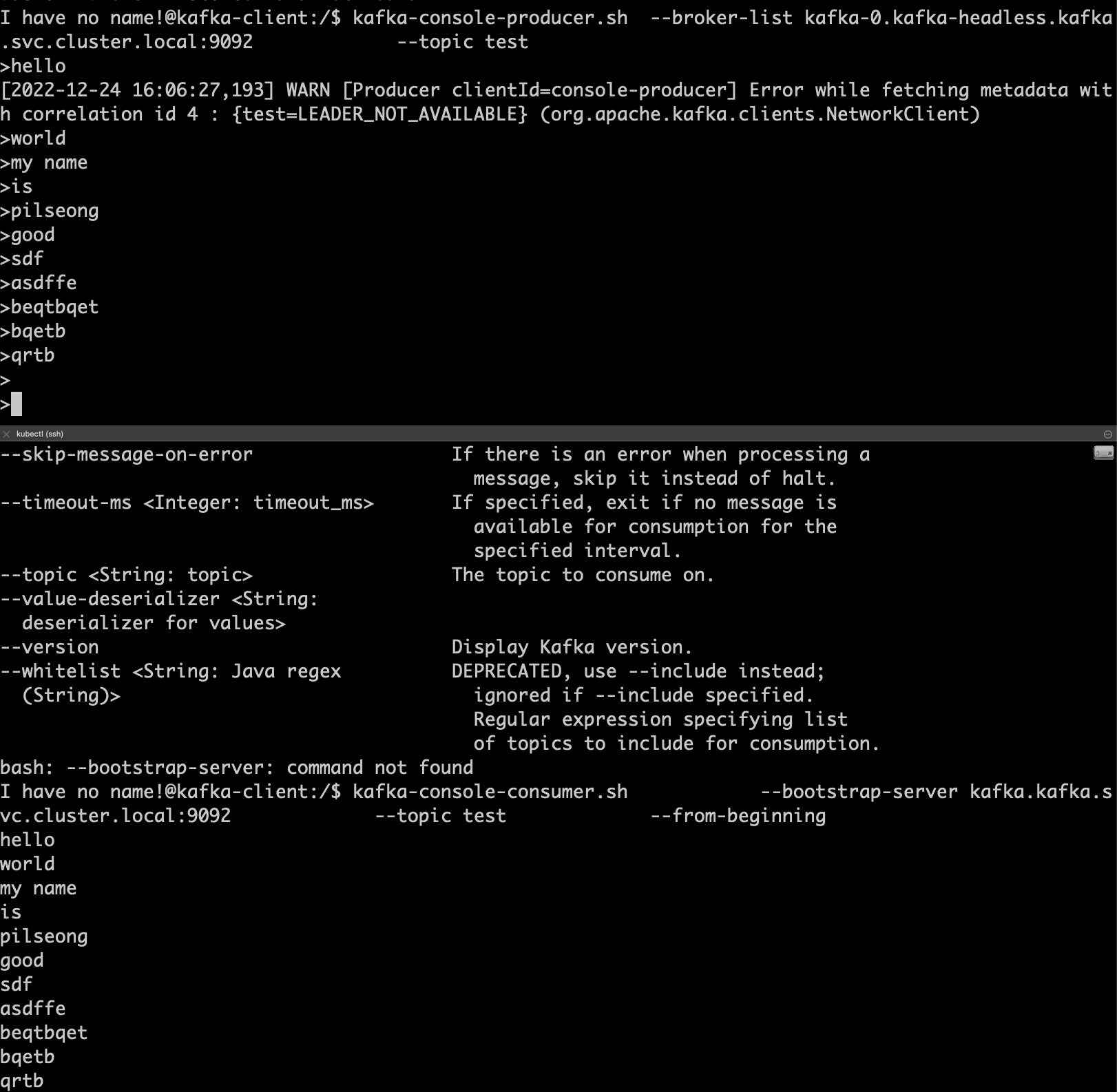 kafka-console-producer.sh --broker-list kafka-0.kafka-headless.kafka.svc.cluster.local:9092 --topic test