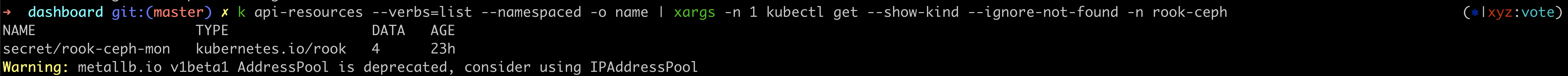 k api-resources --verbs=list --namespaced -o name | xargs -n 1 kubectl get --show-kind --ignore-not-found -n rook-ceph
