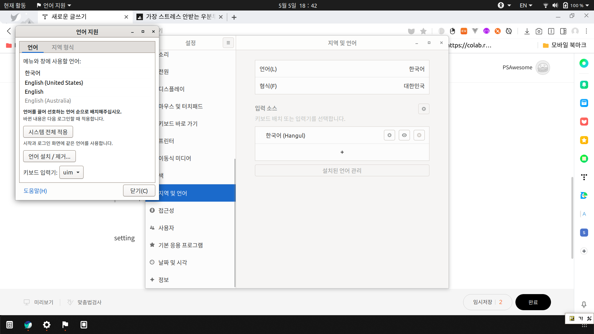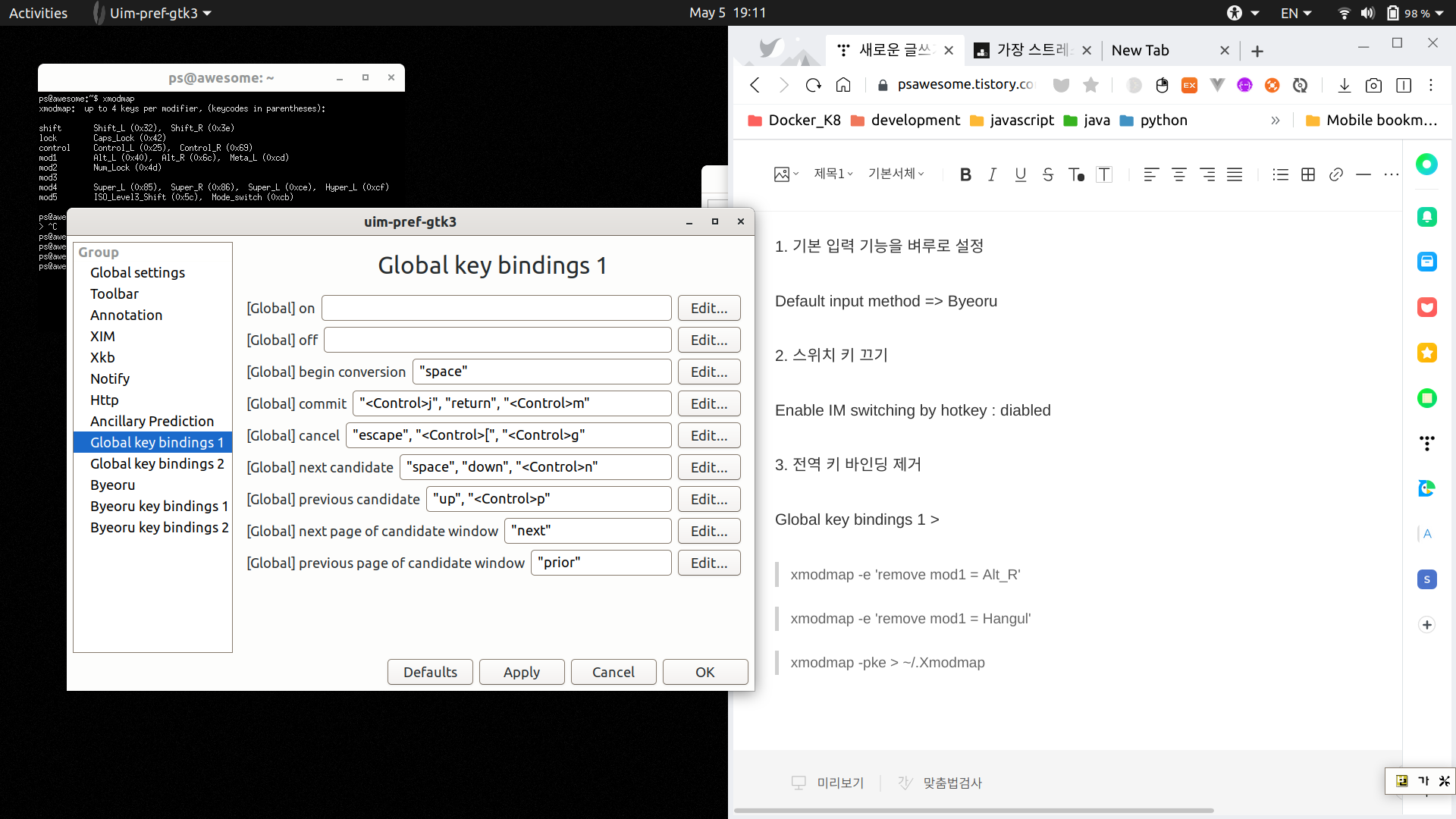 입력기 uim 사용과 한글 키 입력 설정까지의 과정입니다.