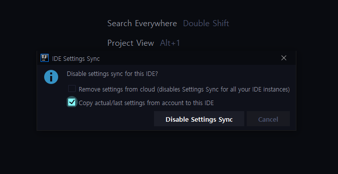 먼저 현재 연결된 설정 동기화를 끊습니다. 이때 현재 설정이 클라우드에 있는 설정으로 반영되도록 체크합니다.