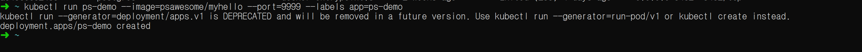 kubectl run ps-demo --image=psawesome/myhello --port=9999 --labels app=ps-demo