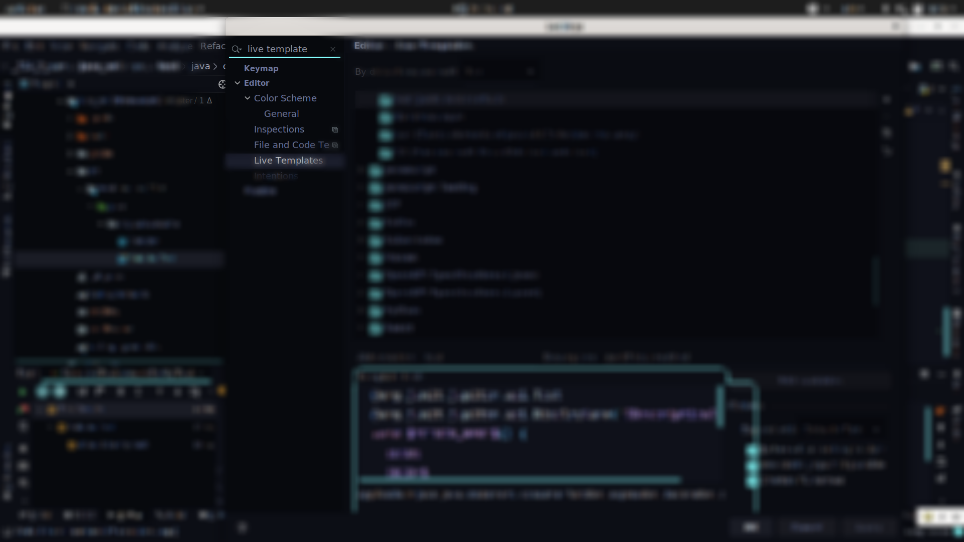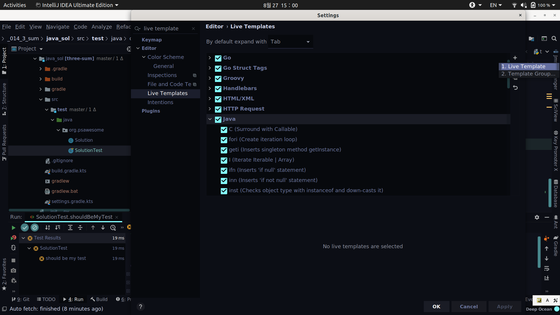 먼저, 설정을 열고 live template을 검색합니다.