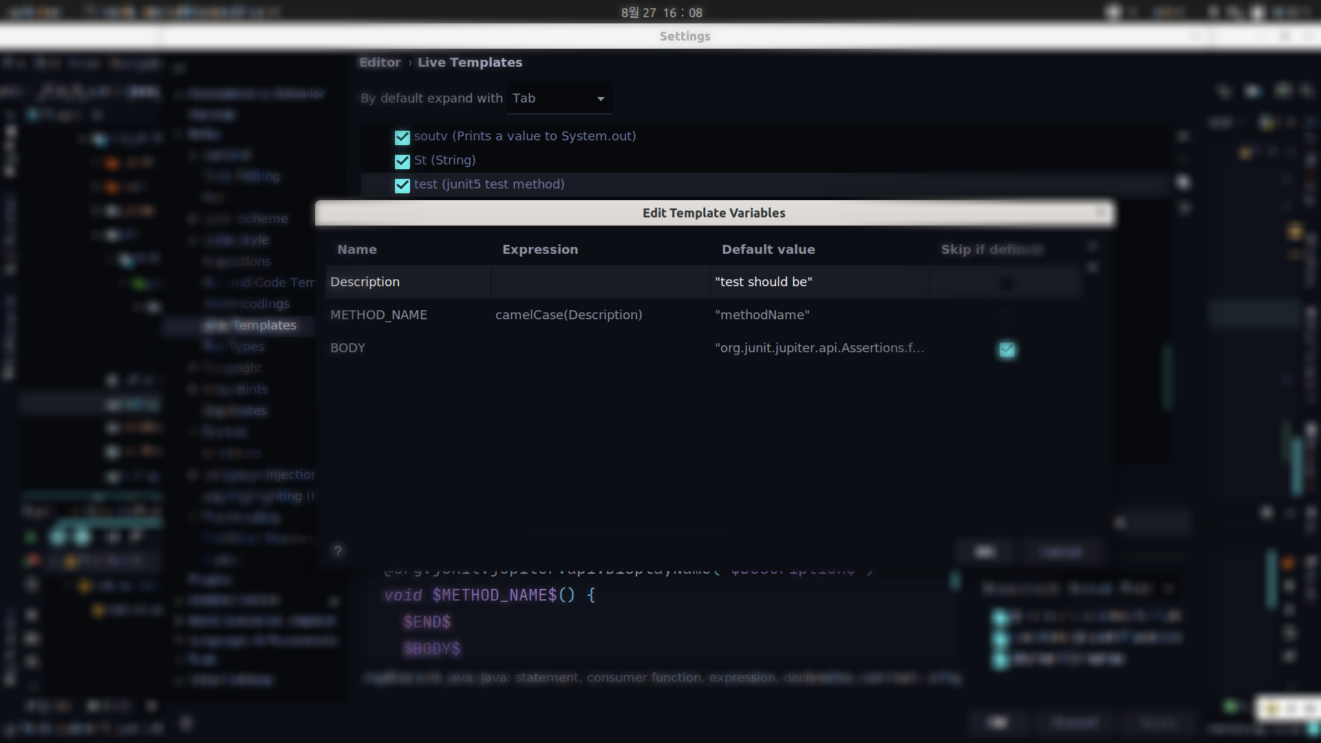 intellij linux keymap 기준으로 Ctrl + J이며, JUnit5 테스트 메서드 템플릿을 등록하는 과정의 글입니다.