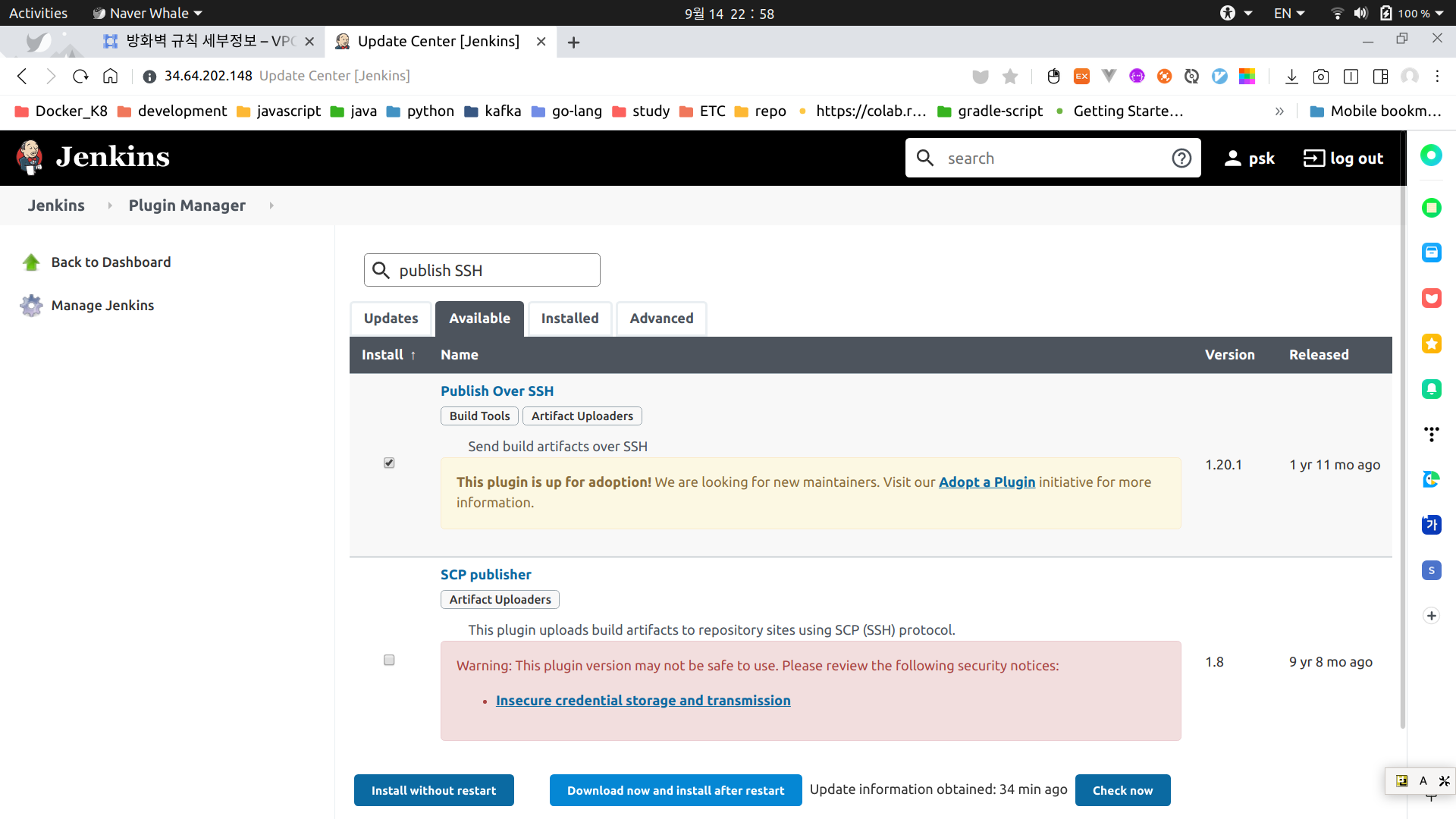 A 서버(젠킨스)에서 B 서버로 접속하여 명령어를 실행하기 위해 plugin을 설치합니다.