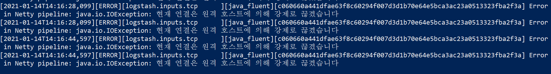 [2021-01-14T12:51:15,227][WARN ][logstash.outputs.elasticsearch][java_logback] Attempted to resurrect connection to dead ES instance, but got an error. {:url=>"http://localhost:9200/", :error_type=>LogStash::Outputs::ElasticSearch::HttpClient::Pool::HostUnreachableError, :error=>"Elasticsearch Unreachable: [http://localhost:9200/][Manticore::SocketTimeout] Read timed out"}