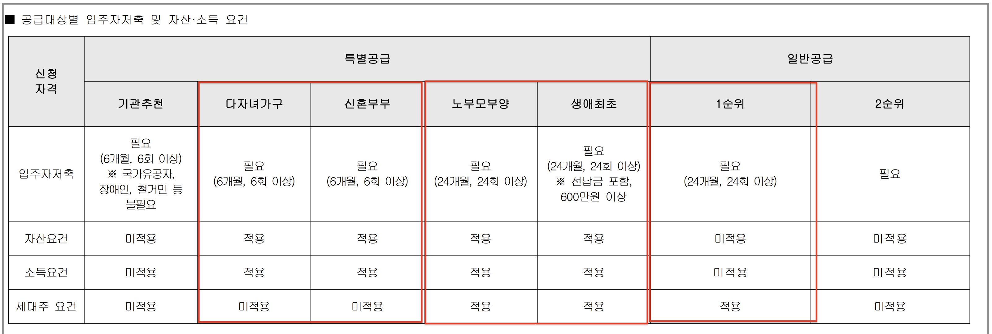 특공의 경우 자산요건, 소득요건은 공통으로 적용되고,