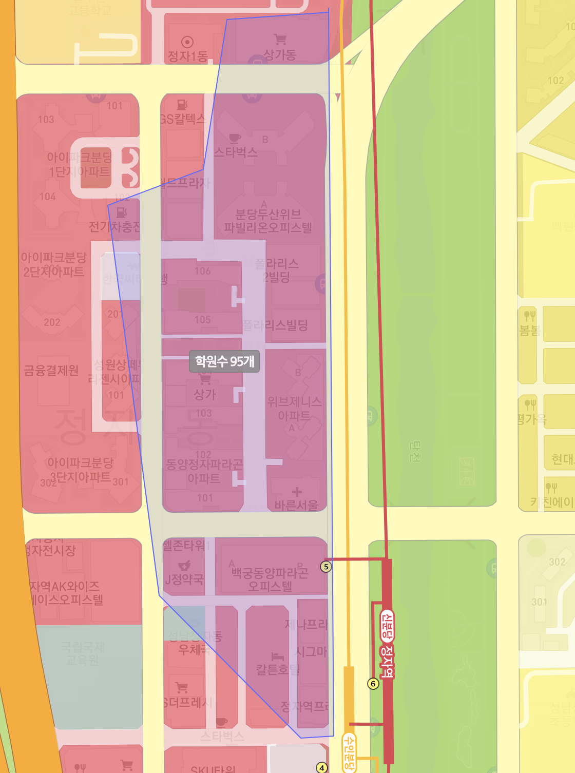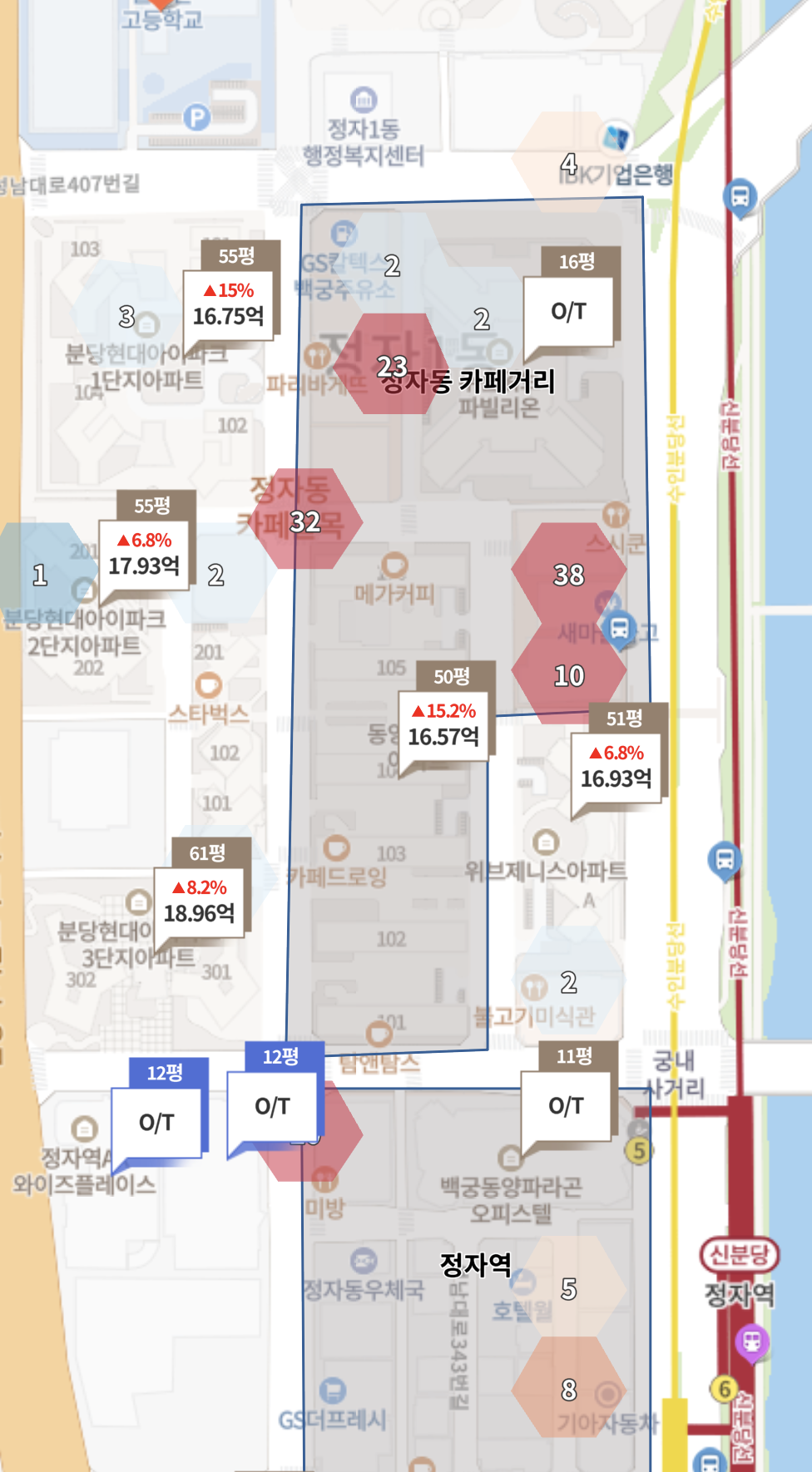 이번 임장은 왼쪽 상업지구 정자동의 내용입니다.