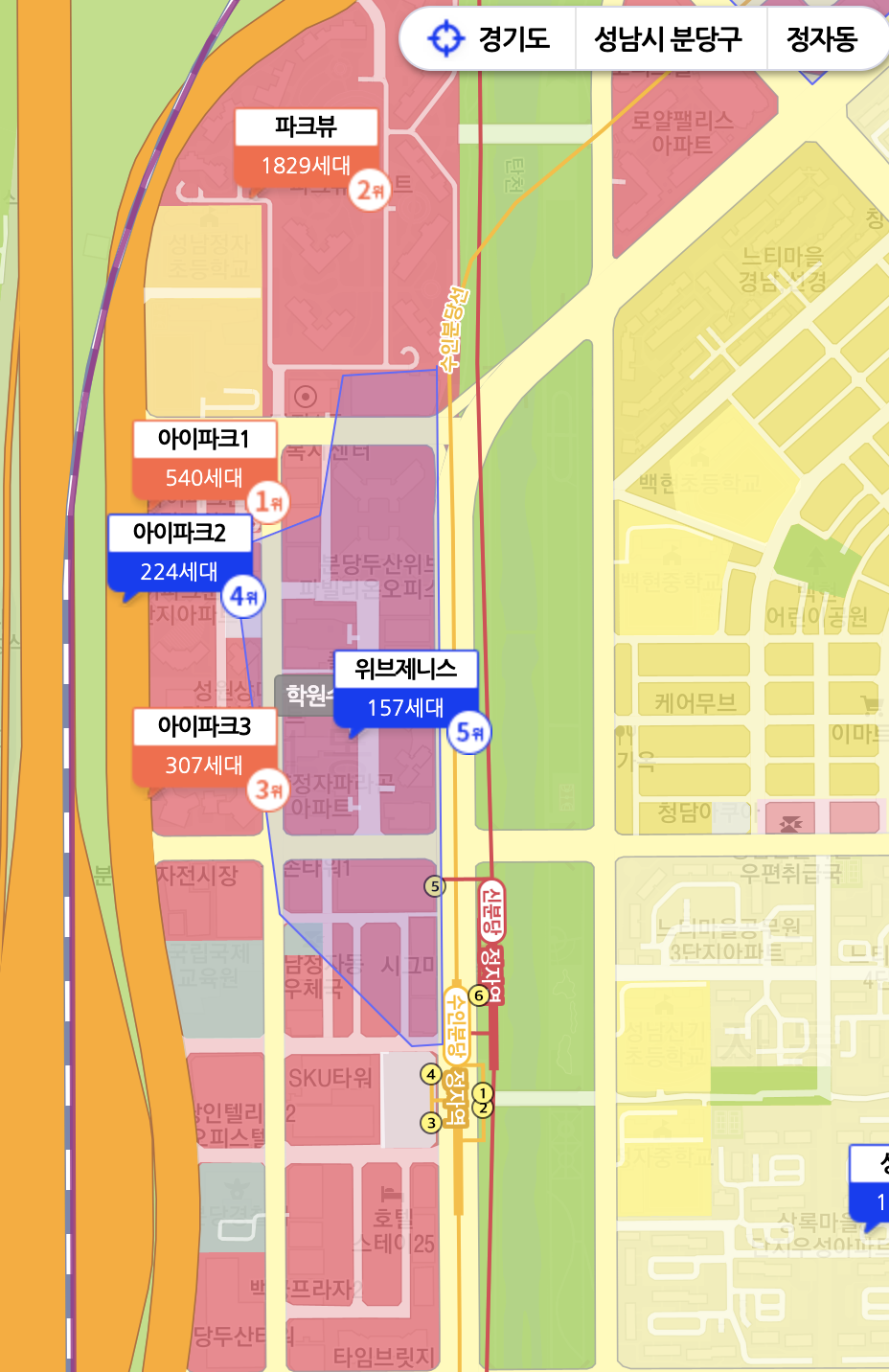 정자동에서 최고가 아파트인 `아이파크1`, 평당 가격이 가장 높은 `파크뷰 아파트`