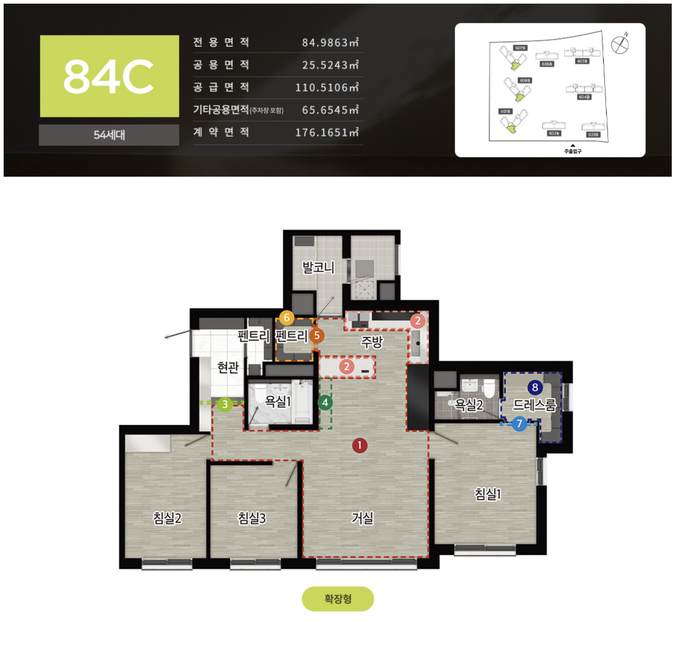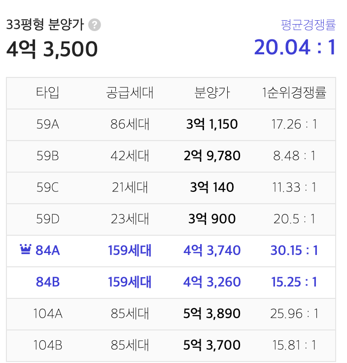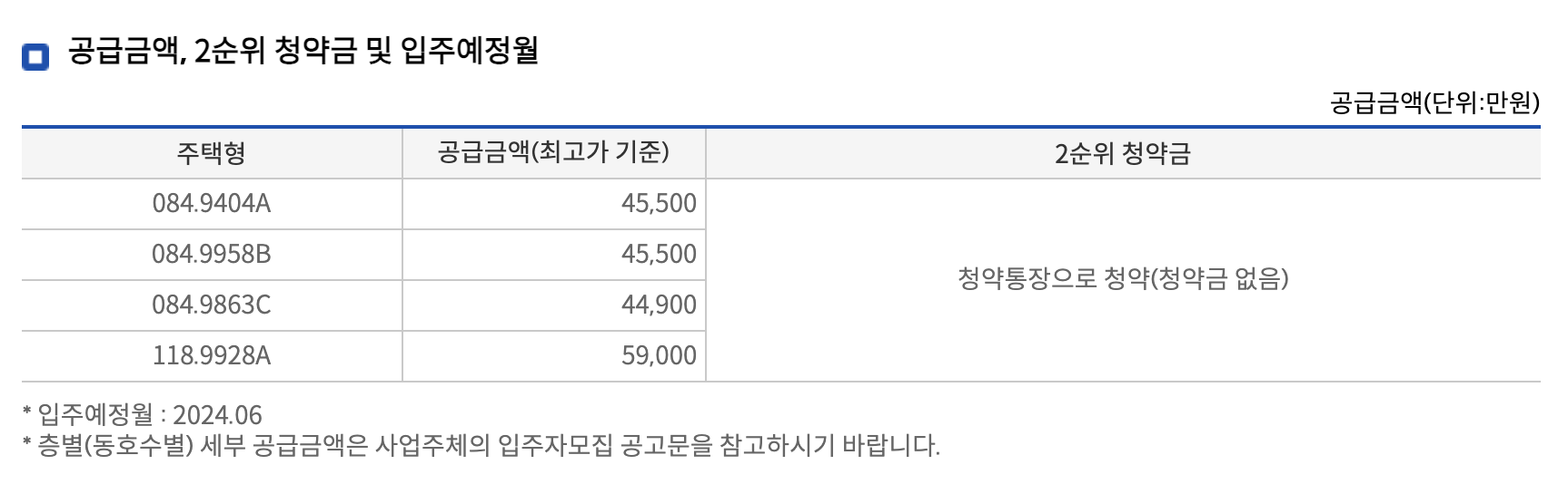 - 세대 : 요즘 수도권에 분양하는 세대를 보면 적당히 또는 살짝 많이 공급한다고 느껴지는 세대 수입니다. 가점이 낮을 경우 전략적으로 당첨 확률을 높여볼 수 있습니다.
