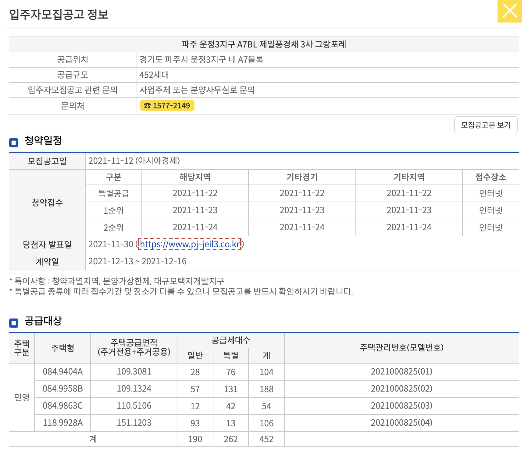 - 당첨자 발표일: 2021-11-30, GTX 운정 그랑포레와 당첨일이 겹치지 않습니다. :-)