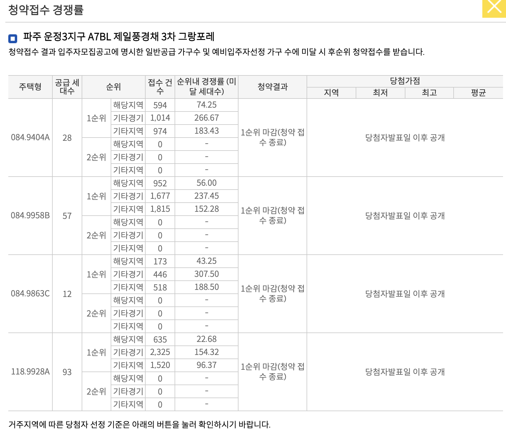 안녕하세요. 분양을 언제 하는지 관심을 갖고 보던 운정신도시 청약 경쟁률이 공고되어 글을 작성합니다.