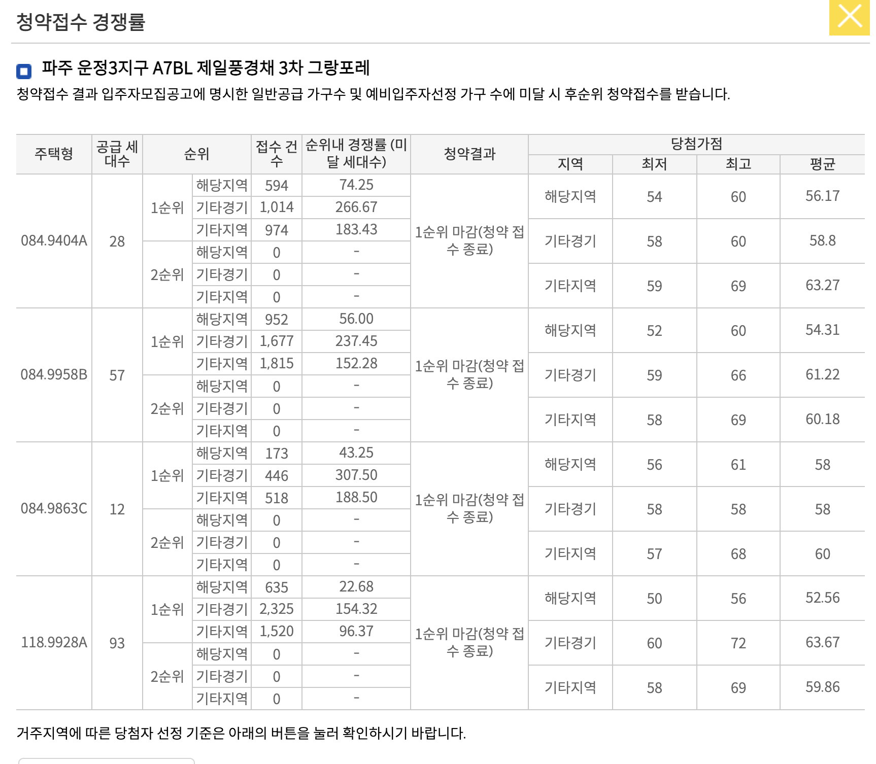 C타입 최고 경쟁률 안녕하세요. 분양을 언제 하는지 관심을 갖고 보던 운정신도시 청약 경쟁률이 공고되어 글을 작성합니다. 경기도 파주시 운정3지구 내 A7 블록 - 제일풍경채 3차 그랑포레 먼저